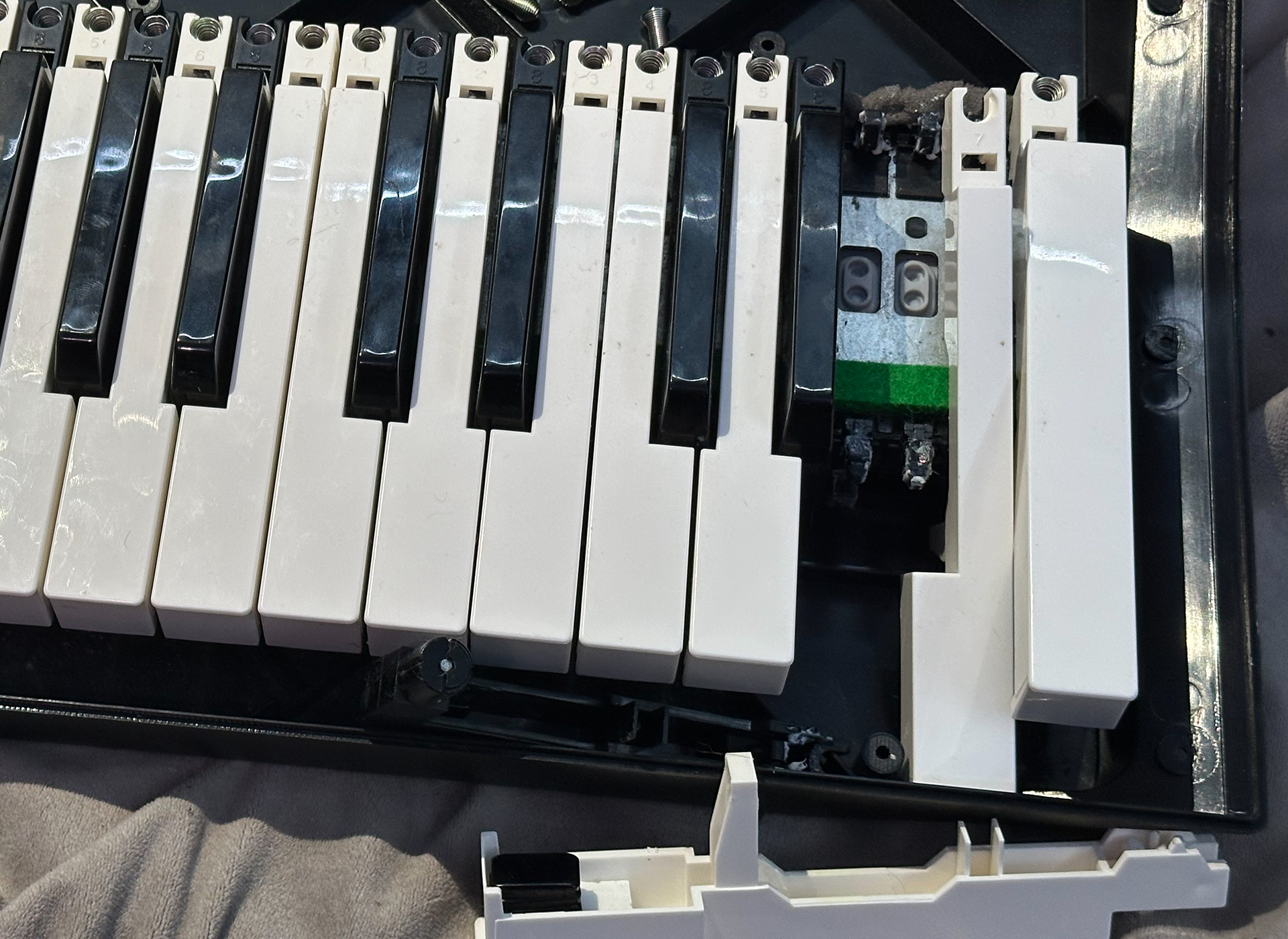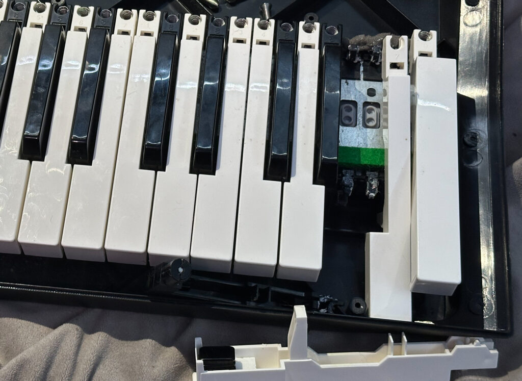 After that, I could carefully lift the top off the keyboard and detach the ribbon and power cables. Now, the keybed was exposed and I could either remove each key in turn or unscrew the whole keybed and turn it over to access the inside of the keys.