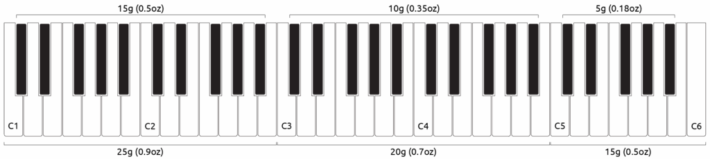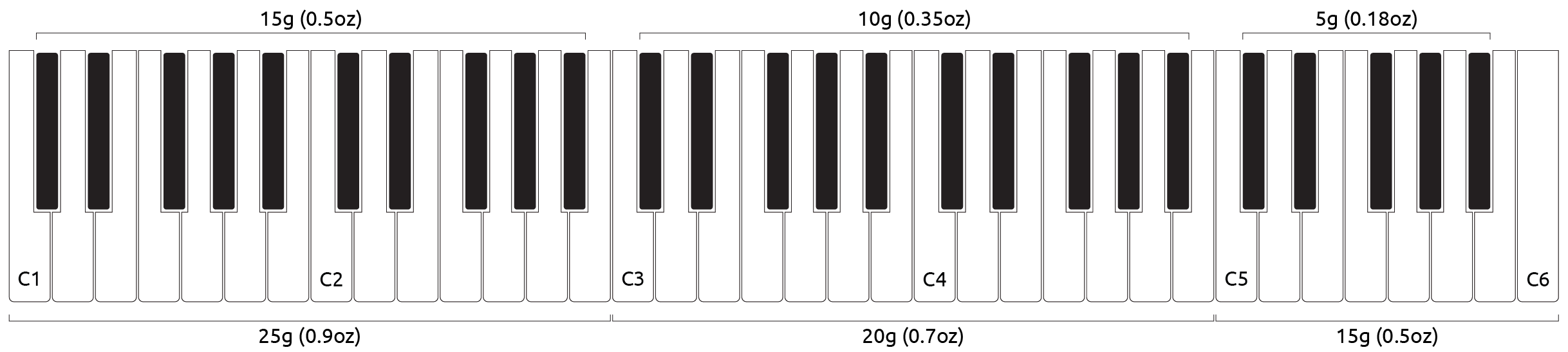 And for the top octave, I only had 3 weights per white key, so I placed them in a column against the flat underside. The black keys only had 1 weight, which was placed at the outer edge along the wall.