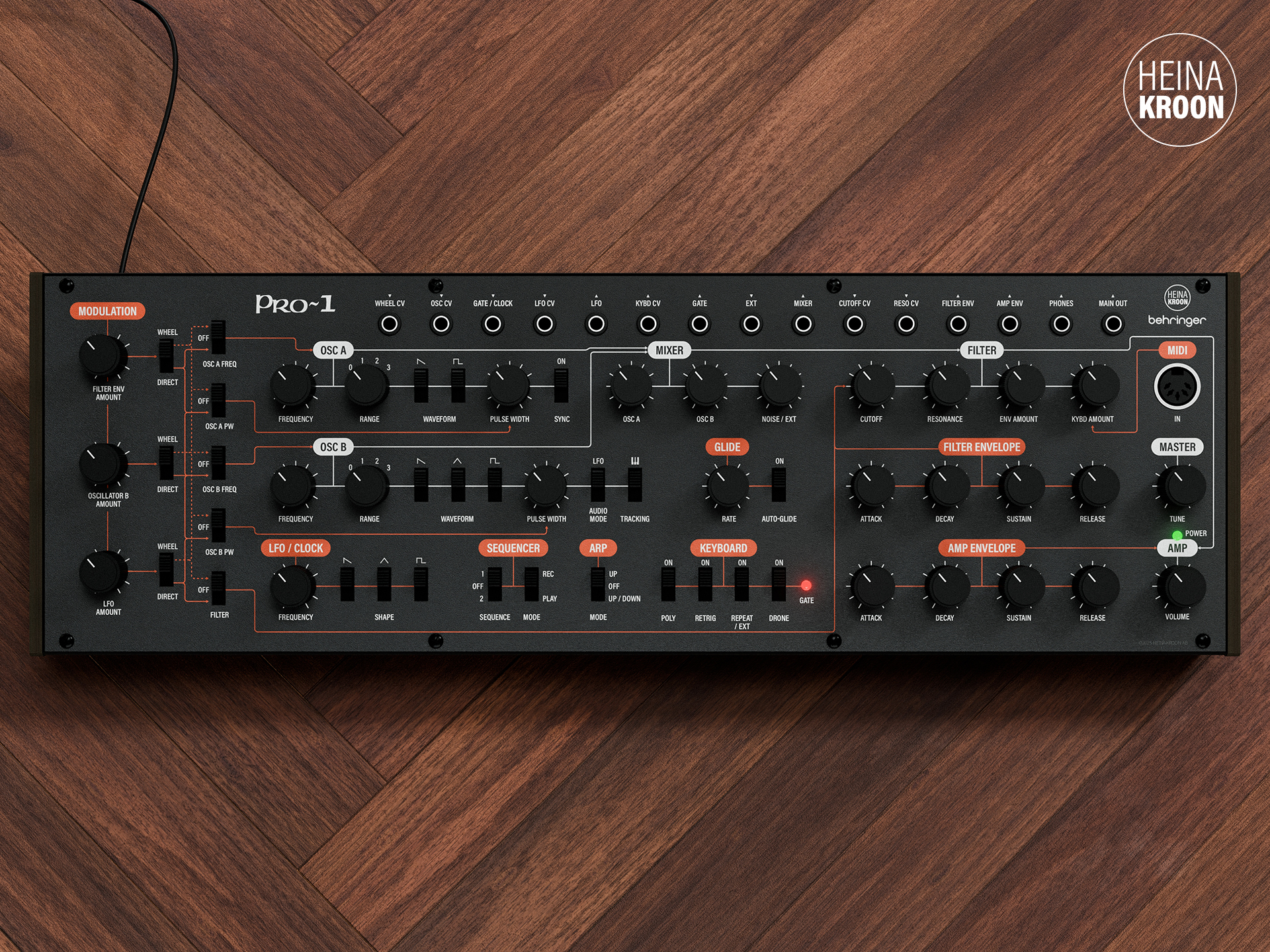 The dark panel is accented with subtle orange signal-path markings, guiding the eye naturally across each section without adding clutter. The result is a panel that feels modern, cohesive and effortless to navigate.